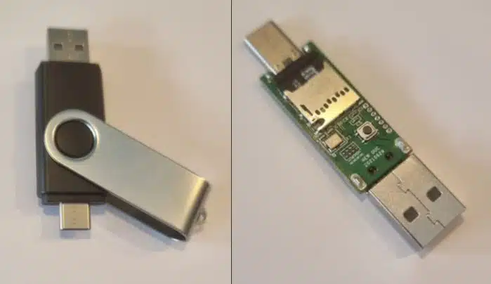 Links: Rubber Ducky USB-Stick. Sieht aus, wie jeder beliebige USB-Speicherstick. Rechts: Rubber Ducky von innen, mit Micro SD-Karte und Taster zum Aktivieren und Deaktivieren.